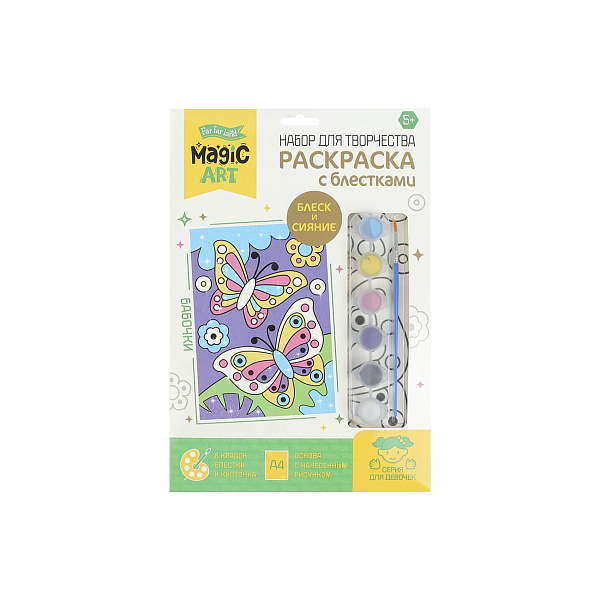 Этот набор для рисования поможет юному художнику освоить технику работы с блёстками. С его помощью малыш будет улучшать фантазию, воображение и образное мышление, создавая оригинальные поделки. Готовую картину с изображениями двух бабочек можно повесить на стену в детской комнате.