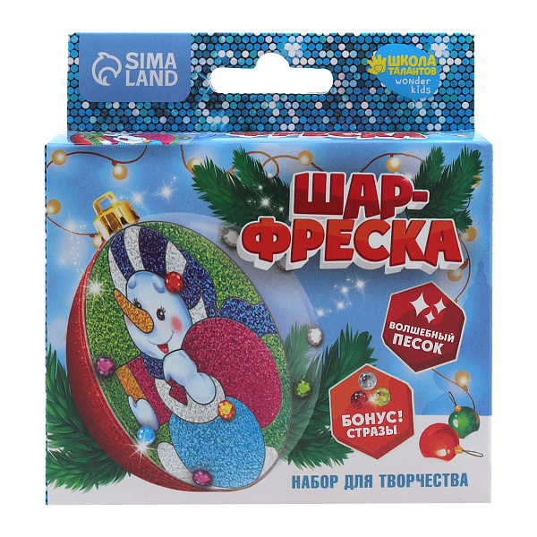 Материалы набора — цветной песок и блестки — легко фиксируются на фреске, создавая яркое и текстурное изображение, а пластик шара обеспечивает надежную и красивую основу для поделки. Такой набор развивает творческие способности, мелкую моторику и внимание у детей, а готовое изделие станет ярким и оригинальным акцентом праздничного интерьера.