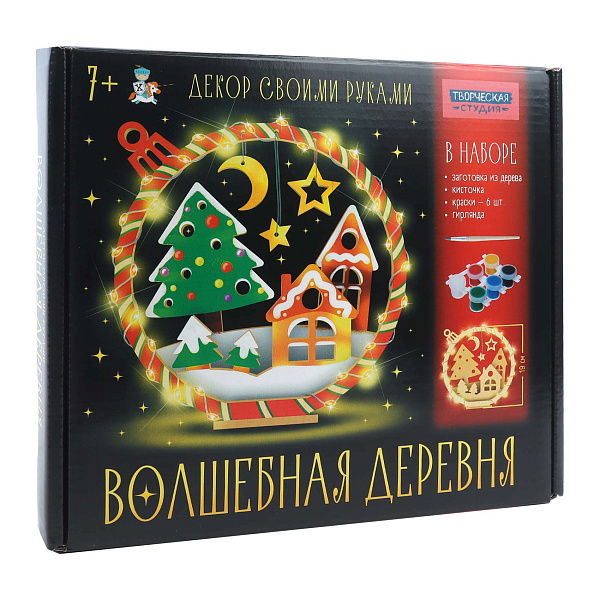 Набор для творчества «волшебная деревня» — творческий набор, предназначенный для детей от 7 лет, который позволит создать уютный зимний декор, наполняющий интерьер атмосферой тепла и праздника. В набор входят многослойные деревянные заготовки с изображением домика, ёлочек, луны, звёзд и декоративная рама, а также кисточка, набор акриловых красок (6 цветов) и гирлянда из светодиодов для подсветки.