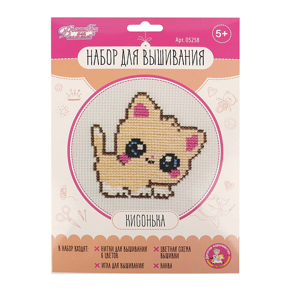 Набор для вышивания — это не только полезное, но и увлекательное занятие, которое принесет радость и позволит ребенку развивать свои творческие способности. Готовая вышивка может стать прекрасным украшением детской комнаты. В комплекте есть все необходимое для работы: цветная схема для вышивания милого котенка, нитки шести цветов, безопасная пластиковая игла, канва.