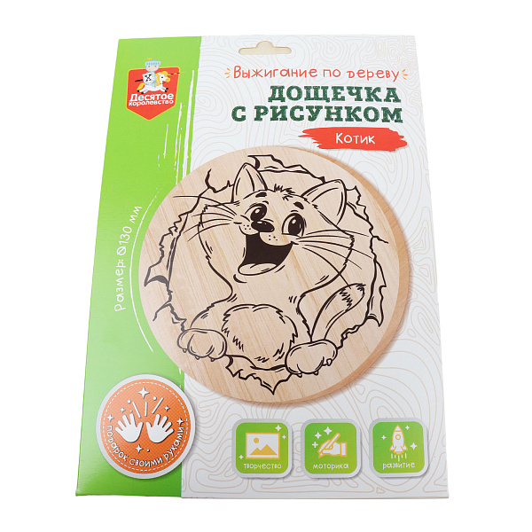 Набор для выжигания по дереву «Дощечка с рисунком: Котик» — это замечательный творческий комплект для детей, который позволяет освоить технику выжигания и создать оригинальный декоративный предмет с изображением милого котенка. В набор входит деревянная дощечка диаметром 130 мм из фанеры с нанесённым рисунком, по которому необходимо аккуратно выжигать узоры.