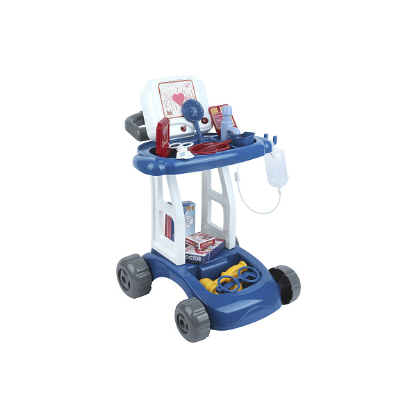 Удобная тележка в виде столика врача на колесиках облегчает процесс транспортировки игрушек из комнаты в комнату. Сбоку в нее установлен кран с пластмассовым резервуаром, куда малыш сможет влить воду, а затем нажатием одной кнопки наливать ее в стакан для «пациента».
