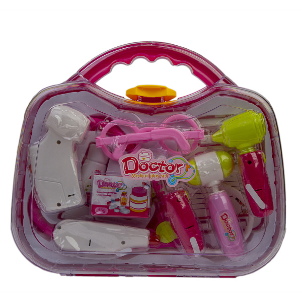 Набор доктора в чемоданчике прекрасно подходит для сюжетно-ролевых игр в больницу. Такие игры можно использовать перед настоящим походом к врачу, чтобы малыши не боялись предстоящих процедур и осмотров. В набор входят различные медицинские принадлежности, среди которых есть стетоскоп, аппарат для измерения давления, молоточек для проверки рефлексов, градусник, упаковка с пилюлями, очки, планшет для записей. Весь набор укомплектован в удобный и стильный розовый чемоданчик с ручкой.