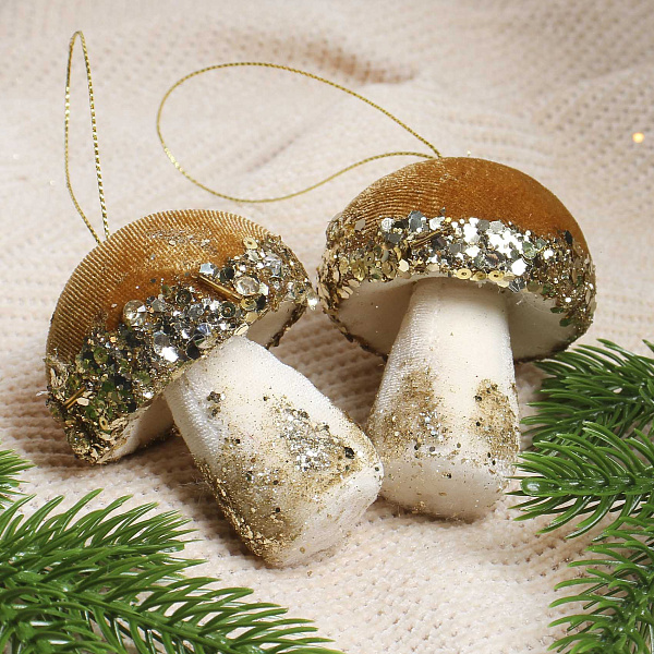Набор из 2 елочных игрушек в виде грибов в винтажном золотом оттенке — стильное украшение для новогодней елки и праздничного декора. Изготовленные из велюра с мягкой текстурой и украшенные блестящими пайетками и блестками, эти елочные игрушки высотой 7 см привлекают внимание своей изысканной фактурой и теплой цветовой гаммой. Каждое изделие оснащено шнурком для подвешивания.
