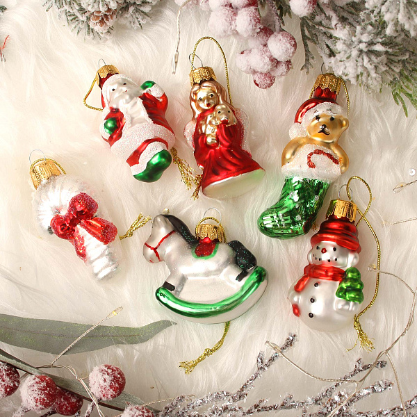 Набор из 6 миниатюрных елочных игрушек высотой 7 см, выполненных из стекла в классическом новогоднем стиле. В комплект входят фигурки Деда Мороза, снеговика, ангела, мишки в носке, лошадки-качалки и сахарной трости с бантиком. Каждая игрушка ярко раскрашена и украшена блестящими элементами, что придает им выразительный и праздничный вид. Игрушки оснащены золотистыми петельками для удобного подвешивания на елку. Этот набор станет прекрасным дополнением к новогоднему декору и подарком для любителей традиционных украшений.