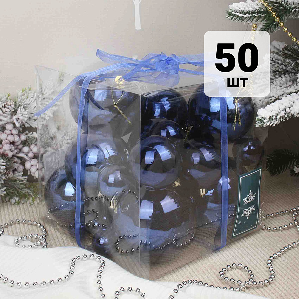 Набор из 50 елочных шаров насыщенного синего цвета с глянцевым покрытием, выполненных из легкого пластика диаметром 2-10 см. Шары обладают ярким блестящим покрытием, придающим интерьеру праздничное сияние и глубину цвета. Каждый шар оснащен крепким колпачком с петлей для удобного и надежного подвешивания на елке или в декоративных композициях. Этот набор станет отличным выбором для создания классического и элегантного новогоднего декора.
