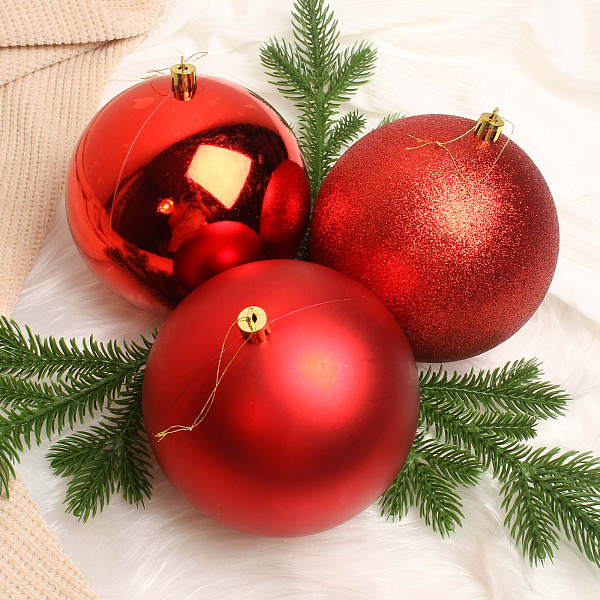 В набор входят три елочных шара красного цвета разных фактур: матовые, глянцевые и блестящие. Диаметр каждого шара составляет 12 см. Шары упакованы в прозрачную коробку с красной лентой. Изделия имеют золотистые крепления для подвешивания. Красный цвет гармонично сочетается с любым традиционным декором. Набор предлагает простое и яркое решение для создания праздничной атмосферы.