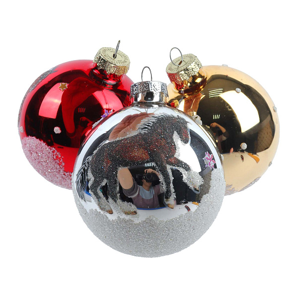 Елочное украшение в виде стеклянного шара диаметром 8 см, выполненное в классическом стиле. Игрушка выполнена с изображением лошади и декоративными элементами, напоминающими снежный покров. Подвеска оснащена металлическим колпачком и ниткой для удобного крепления на новогоднюю елку.