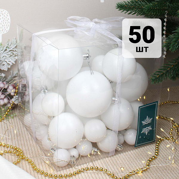 Набор из 50 елочных шаров белого матового цвета, выполненных из легкого пластика диаметром 2-10 см. Шары обладают нежной бархатистой матовой поверхностью, которая придает интерьеру мягкость и элегантность, создавая атмосферу спокойного и стильного праздника. Каждый шар оснащен крепким колпачком с петлей для удобного и надежного подвешивания на елке или в декоративных композициях. Этот комплект станет прекрасным выбором для создания сдержанного и утонченного новогоднего декора.