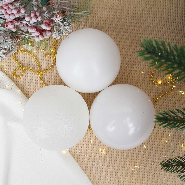 Набор елочных украшений — стильный комплект из 3 шаров диаметром 12 см белого цвета в стиле лофт. В состав набора входят шары с матовой, зеркальной и глиттерной поверхностями, создающие эффектный и гармоничный акцент в новогоднем интерьере. Легкие пластиковые шары оснащены креплениями с петлями для удобного подвешивания на елку или в декоративные композиции. Этот набор станет отличным выбором для создания современного и модного праздничного декора, подчеркивая свежесть и элегантность оформления.