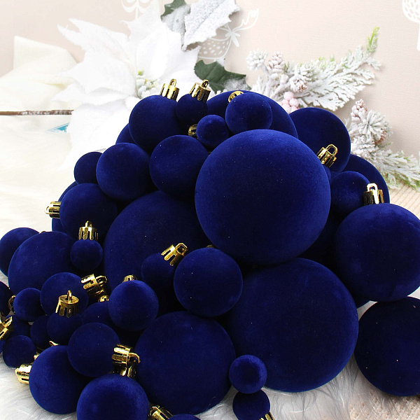 Набор елочных шаров с бархатистым покрытием темно-синий 50шт 2-10см