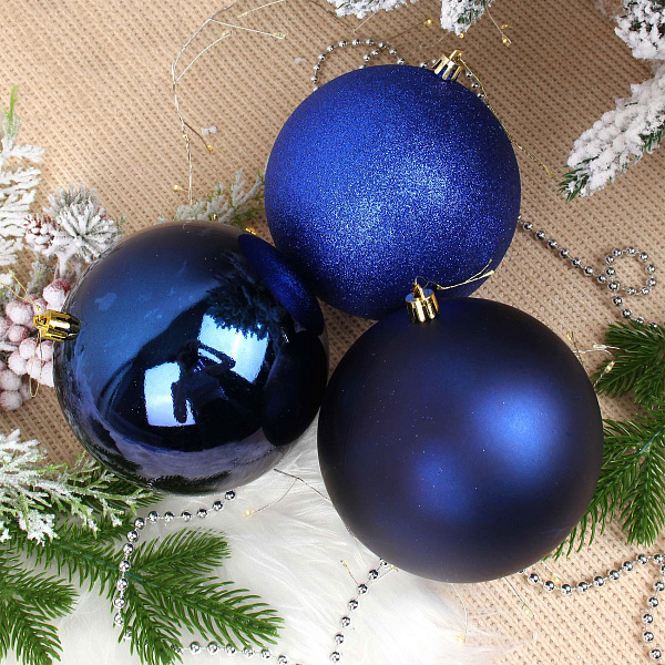 Набор из 3 елочных шаров в синих оттенках в стиле лофт — элегантное и современное украшение для новогодней елки и праздничного интерьера. Диаметром по 12 см каждый шар выполнен из пластика с разной поверхностью: один покрыт мелким синим глиттером, создавая эффект мерцания, второй — матовый темно-синий, третий — глянцевый насыщенный синий. Такой набор гармонично дополнит любую елочную композицию, придавая ей глубину и изысканный оттенок.