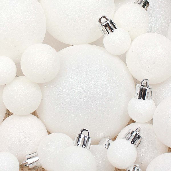 Набор новогодних украшений — изящный комплект из 50 шаров белого цвета с блестящим глиттерным покрытием диаметром от 2 до 10 см. Искрящаяся поверхность придаёт шарам нежное мерцание и праздничное сияние, создавая атмосферу волшебства и чистоты в праздничном интерьере. Легкие пластиковые шары оснащены креплениями с петлями для удобного и надёжного подвешивания на ёлке и в декоративных композициях. Этот набор станет прекрасным выбором для создания яркого и свежего новогоднего декора, подчёркивая элегантность и легкость оформления.