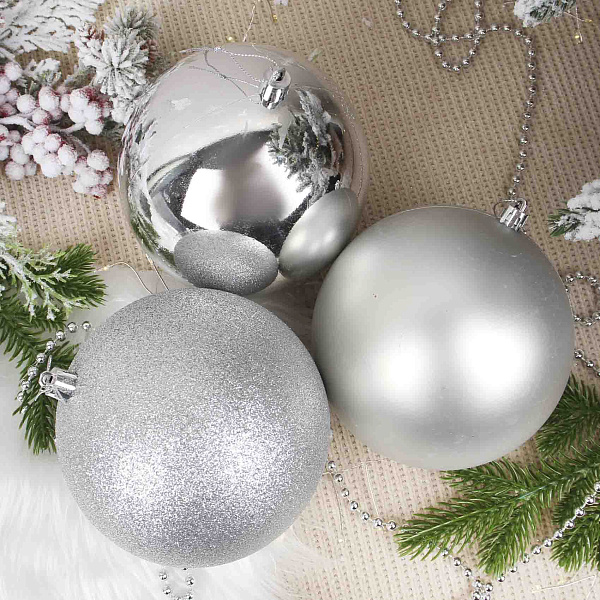 Набор из 3 елочных шаров в серебристом цвете в стиле лофт — элегантное и современное украшение для новогодней елки и праздничного интерьера. Диаметром по 12 см каждый шар выполнен из пластика с разной поверхностью: один покрыт мелким серебряным глиттером, создавая эффект мерцания, второй — матовый, третий — глянцевый. Такой набор гармонично дополнит любую елочную композицию, придавая ей глубину и изысканный оттенок.