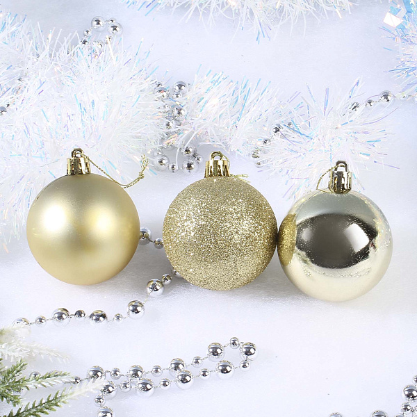 Изящный набор золотистых елочных шаров станет ярким украшением праздничного интерьера. В комплект входят 3 шара диаметром 6 см. В наборе три шара с разными покрытиями: блестящим, матовым и зеркальным.