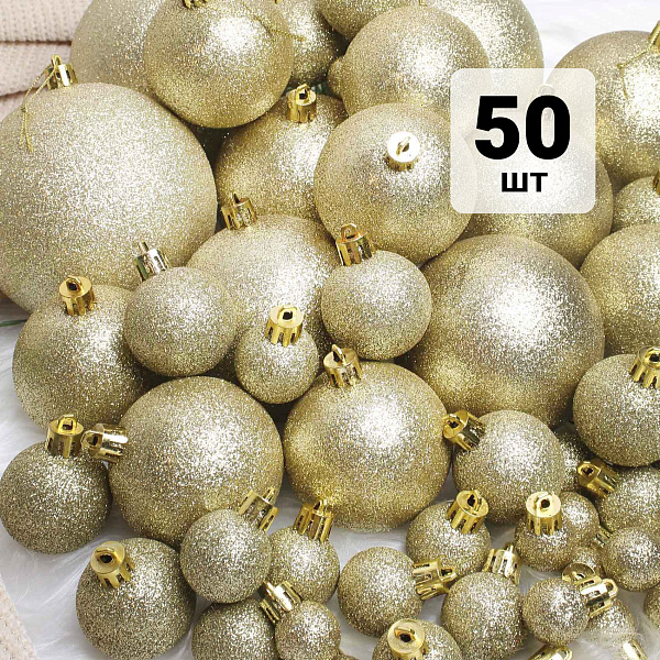 Набор елочных шаров с блестящей поверхностью включает в себя разнообразные украшения золотистого цвета. В комплекте находятся шары диаметром от 2 до 10 см, всего 50 штук. Разные размеры позволяют создать объемную и яркую композицию на новогодней елке или в праздничном декоре комнаты.