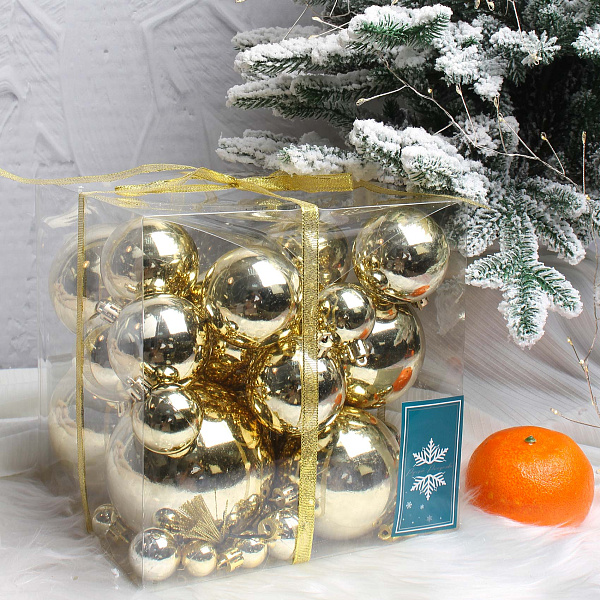 Набор елочных шаров золотистого цвета состоит из 50 украшений с глянцевой поверхностью. В комплект входят шары разных размеров — от 2 до 10 см в диаметре. Такое набор помогает создавать разнообразные комбинации при декорировании новогодней елки.