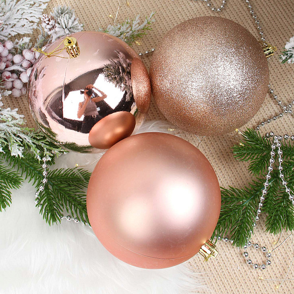 Набор из трёх ёлочных шаров создан для создания праздничного настроения. Каждое украшение отличается своей поверхностью: глянцевая, блестящая и матовая. Все шары выполнены в нежном пудрово-розовом оттенке. Диаметр каждого шара составляет 12 сантиметров, что делает их заметными на ёлке и позволяет легко комбинировать с другими украшениями.