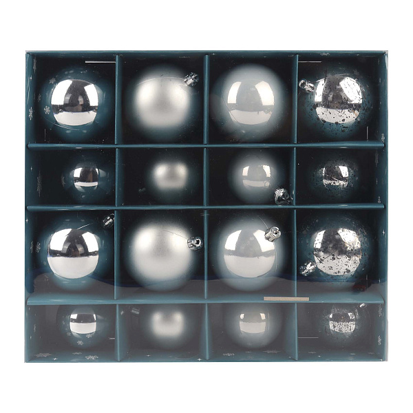 Набор из 16 украшений включает серебристые шары, выполненные из прочного пластика. Диаметр шаров составляет 8 см и 6 см, что создает разнообразие и позволяет создать гармоничную композицию на новогодней елке.