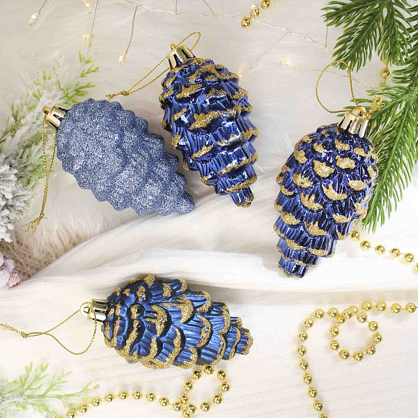 Набор украшений «Шишки» — это стильный комплект из 4 елочных игрушек в форме шишек, выполненных из пластика с винтажной отделкой. Каждая шишка окрашена в синий цвет с золотым блестящим декором, создающим эффект мерцания, что придает украшениям праздничный и элегантный вид.