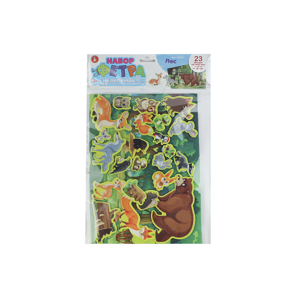 Набор из фетра вызовет неподдельный интерес у ребенка старше 3 лет, позволит ему весело и с пользой провести время. В комплект входит игровое поле с изображением лесной поляны и 23 фигурки разных животных и птиц. Элементы снабжены липучками, легко фиксируются на текстильной поверхности. Дети смогут познакомиться с обитателями леса, узнают много важных фактов из их жизни.