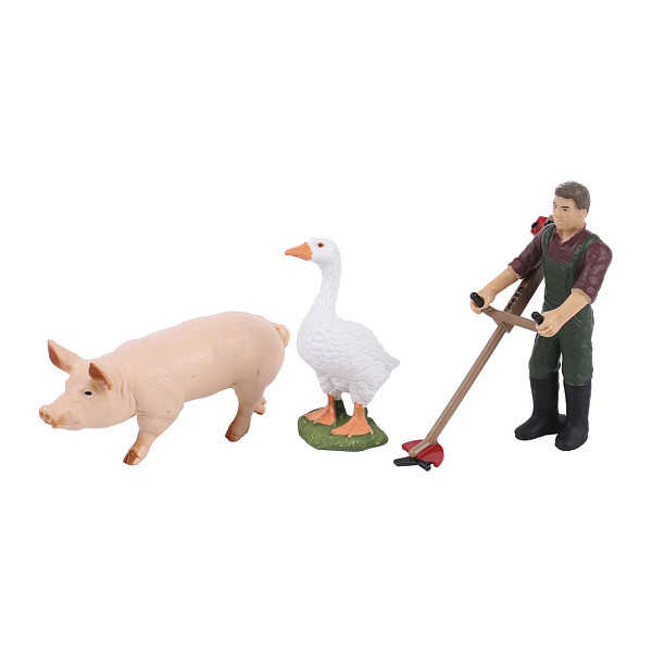 Игровой набор «Ферма» включает три фигурки: фермер, гусь и свинья. Каждая фигурка создает атмосферу сельской жизни. Фермер одет в рабочий комбинезон, держит газонокосилку.