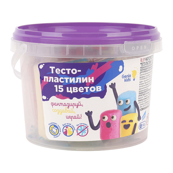 Набор тесто-пластилина «Genio Kids» включает 15 ярких цветов по 30 г каждый. Пластилин упакован в удобное ведро с крышкой, что облегчает хранение и транспортировку. В комплект входят три формы для создания фигурок и стек для моделирования.