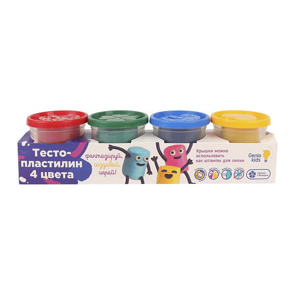 Тесто-пластилин Genio Kids – уникальный набор для творческих игр, состоящий из четырех баночек с тесто-пластилином разных цветов: красного, зеленого, синего и желтого. Каждая баночка оснащена яркой крышкой с тиснением в виде различных фигурок, что позволяет использовать крышки как штампы для лепки. Тесто-пластилин легко принимает любую форму, не прилипает к рукам и не оставляет следов.
