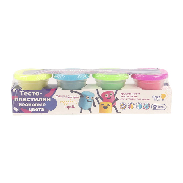 Набор тесто-пластилина «Неоновый» от Genio Kids включает четыре баночки по 50 г с неоновыми цветами: желтый, синий, зеленый и розовый. Каждая баночка имеет крышку, которую можно использовать как штамп для создания узоров и текстур, что добавляет дополнительный элемент веселья.