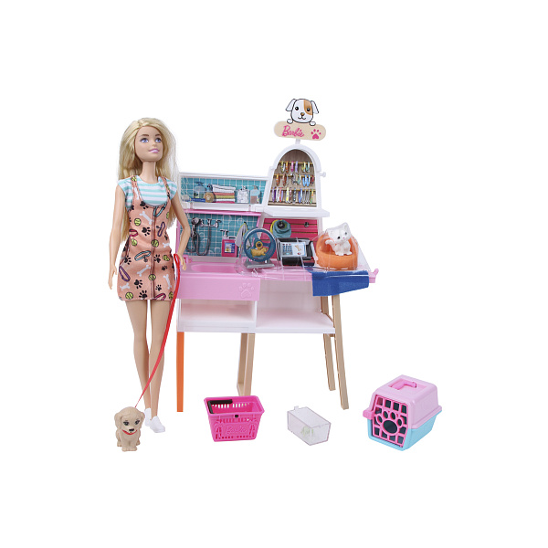 Большой тематический набор "Зоомагазин" позволит детям устроить немало интересных и продолжительных игр. В комплектацию входит кукла Барби, милый песик, котенок с лежанкой, хомяк в колесе, переноска, террариум, сумка, корзинка, мебель, многочисленные аксессуары и приспособления для ухода за животными.