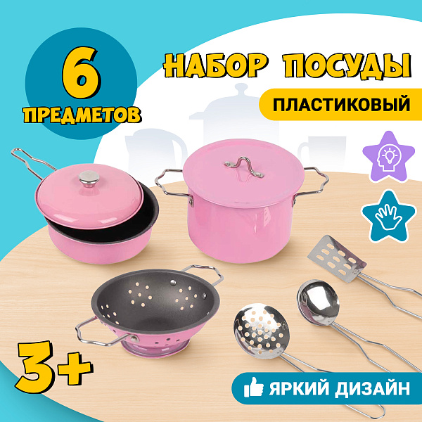 Набор включает в себя кастрюлю с крышкой, сковороду, половник, шумовку, лопатку и ложку. Каждая деталь обладает реалистичным дизайном и отличается прочностью, что гарантирует долговечность и безопасность для маленьких поваров. Яркий розовый цвет добавляет игре веселья и делает набор привлекательным для детей.