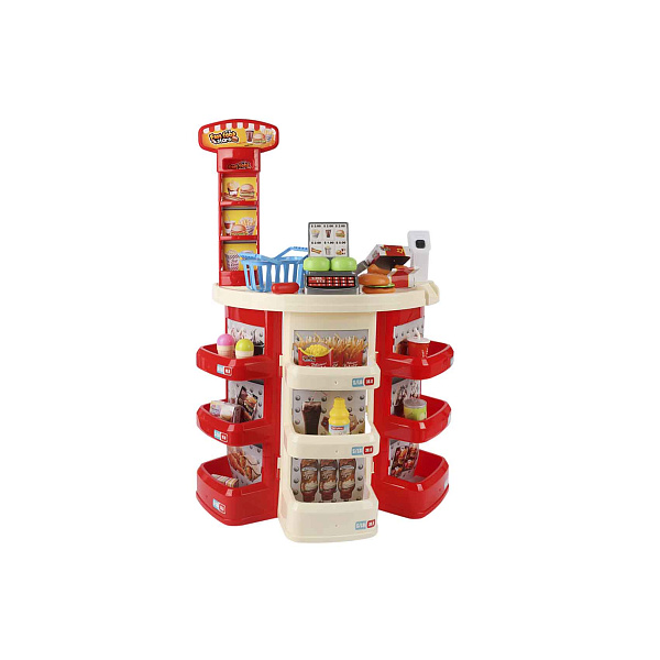 Огромный интерес вызовет увлекательный комплект для детских ролевых игр. Главный элемент набора – стилизованная кассовая станция, выполненная в ярких и насыщенных цветах. Она оснащена кассовым аппаратом с кнопками, весами и экраном.