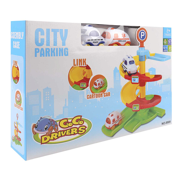 Игровой набор «Городская парковка» создан для увлекательных и познавательных игр. Компактная структура включает несколько этажей парковочной башни с яркими спиралевидными спусками, позволяющими машинкам с легкостью скатываться вниз.