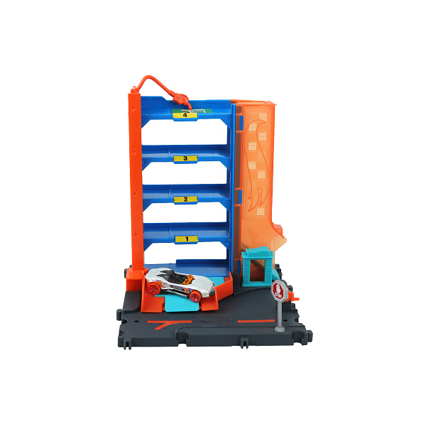 Каждый из четырех уровней соединен с выходом, трамплин сбоку выпускает машинку в новую гонку. С помощью коннекторов парковку можно объединить с другими игровыми наборами бренда Hot Wheels.