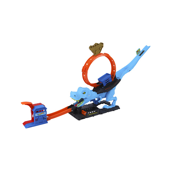 Воплотите в реальность мечты ребенка о захватывающих гоночных приключениях с уникальным набором от Hot Wheels. Этот потрясающий трек в виде тираннозавра и большого кольца предназначен для запуска гоночных машинок, он погружает игроков в атмосферу увлекательных скоростных состязаний.