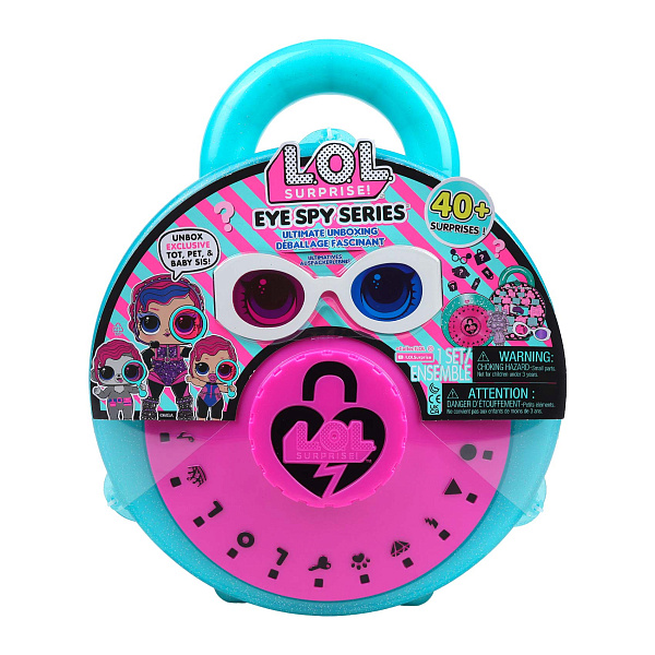 Игровой набор L.O.L. Surprise Eye Spy Series выполнен в виде круглого чемоданчика с ярким дизайном и декоративными очками на крышке. Внутри содержится более 40 сюрпризов — от мини-кукол до аксессуаров, каждый из которых скрыт под несколькими слоями упаковки, что создаёт ощущение постепенного открытия.