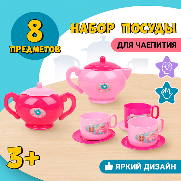 В комплекте 8 предметов: чайник, сахарница, три чашки и три блюдца. Все предметы изготовлены из пластмассы в розовых оттенках. Набор аккуратно упакован в картонную коробку. Его можно выбрать в качестве подарка на один из праздников, например на День рождения или Новый год.