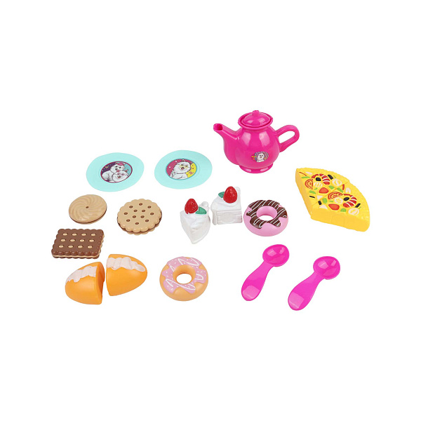 Комплектация: чайник с крышкой, два блюдца, две чайные ложки, четыре куска торта, два пончика, три печенья, два пирожных.