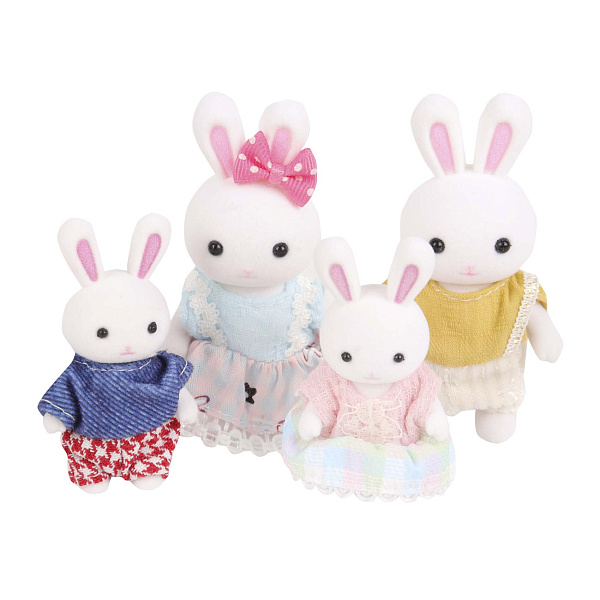 Игровой набор «Семья зайчат» — это набор из четырех милых зайчиков в симпатичных нарядах. В набор входят: мама-зайчиха в нежно-голубом платье с цветочной аппликацией и атласным бантом, папа в синем свитере с красными шортами в клетку, дочка в розовом платьице с белым кружевом и сын в желтом комбинезоне.