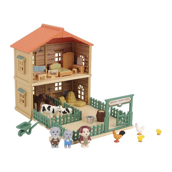 Домик выполнен из прочного пластика с деталями, имитирующими деревенский стиль. В комплекте разнообразные фигурки животных: лошади, коровы, курицы и цыплята, что позволяет детям узнавать больше о жизни на ферме. Для ухода за животными предусмотрены разные инструменты: тачка, ведро, молочный бидон и бочка.
