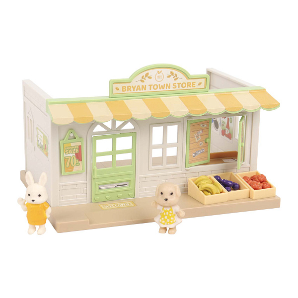 Стены здания украшены имитацией кирпичной кладки и плакатами, окна и двери игрушки открываются и закрываются. Кассовый аппарат и торговые автоматы делают игровые сценарии более интересными и разнообразными. Работниками магазинчика и главными героями игры станут миниатюрные зайчик и собачка.