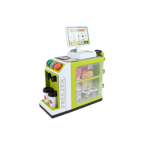 На прилавок, оборудованный полками, можно выставить муляжи продуктов. Затем на кассе самообслуживания «просканировать» товары и оплатить их игрушечными деньгами или картой. Звуковые эффекты при использовании сканера и терминала для оплаты сделают игру еще более реалистичной. Такие игры улучшают социализацию малышей, а также помогают развивать воображение, придумывая новые сюжетно-ролевые игры.