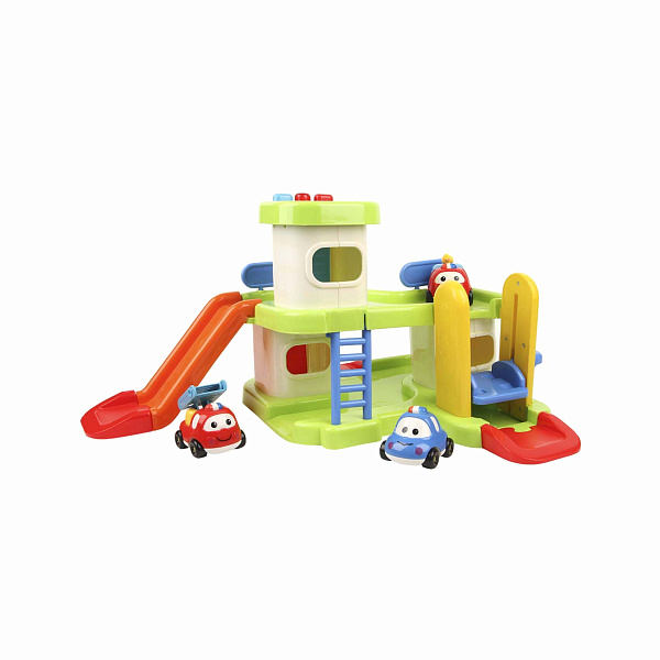 Игровой набор «Полицейская и пожарная станция» содержит две игры в одном комплекте. Из предметов набора можно построить или полицейскую парковку или станцию пожарников. В комплекте представлены блоки для постройки станции, 3 машинки и горка. Станция представляет собой двухэтажное строение с гаражами и вышкой. Машинки и детали строения окрашены в яркие цвета, которые понравятся маленьким детям. При нажатии на кнопки воспроизводятся эффекты.