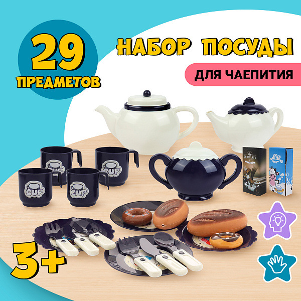 Игровой набор посуды для чаепития и сервировки стола незаменим на кухне у ребенка. Реалистичные элементы обихода станут основой многих сюжетно-ролевых игр. В комплект входят заварочный чайник, молочник и сахарница с крышками, 4 блюдца, 4 чашки, 3 вилки, 3 ложки, 3 ножа, 4 фигурки десерта, коробочки какао и молока. Большое количество предметов открывает широкий простор для фантазии ребенка.
