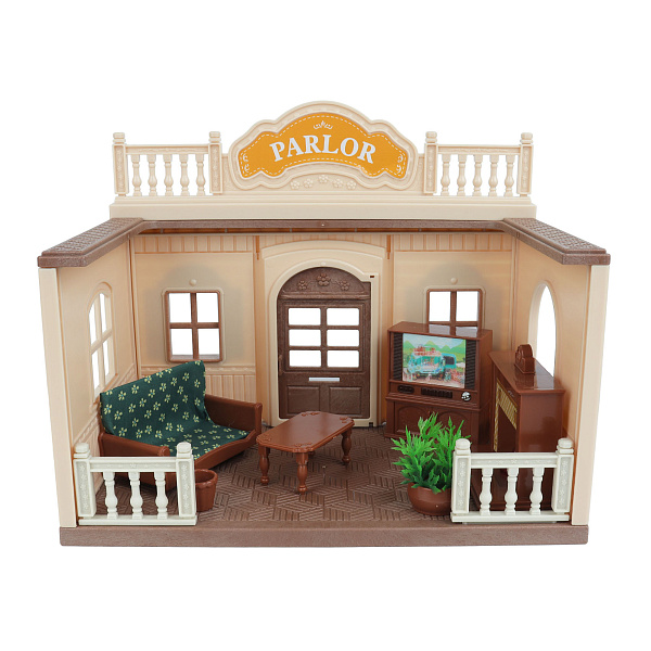 Игровой набор включает уютную обставленную комнату и фигурку кролика в синем комбинезоне. Гостиная выполнена в пастельных тонах с зелеными и коричневыми акцентами. В набор входят диван, столик, телевизор, растения и миниатюрный чайный сервиз с чайником, чашками и тарелками. Все элементы выполнены из безопасного пластика.