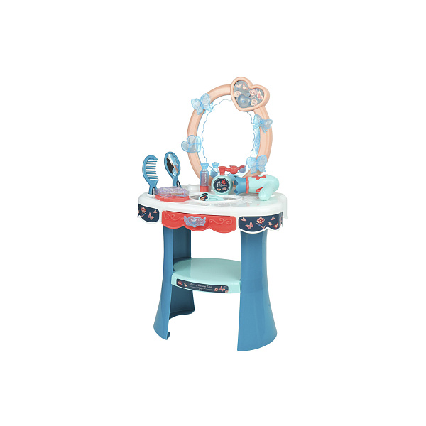 Под основной столешницей предусмотрена дополнительная полка для хранения косметических средств. Игрушка развивает моторику, визуальное восприятие и воображение. Она позволяет девочкам попробовать себя в роли стилиста, парикмахера или визажиста. Набор выполнен из пластика.