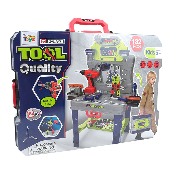 Игровой набор «Верстак с инструментами» включает большой верстак и 132 детали и инструмента для создания различных поделок. В комплект входит шуруповерт с несколькими сменными насадками, который работает на батарейках (не входят в набор). Все элементы удобно хранятся в специальном кейсе.