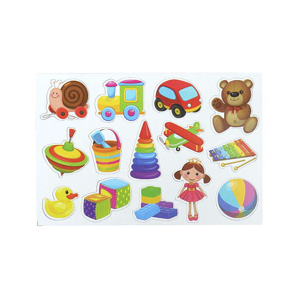 Набор состоит из 14 магнитных фигурок с красочными изображениями детских игрушек, выполненных из картона и полимерных материалов с магнитными элементами.
