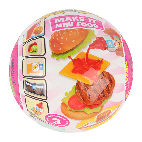 В комплект входят разнообразные элементы: миниатюрные бутылочки, упаковки с ингредиентами и другие аксессуары, создающие реалистичное ощущение приготовления еды. Упаковка выполнена в виде шарика, что добавляет элемент сюрприза и делает распаковку более увлекательной.