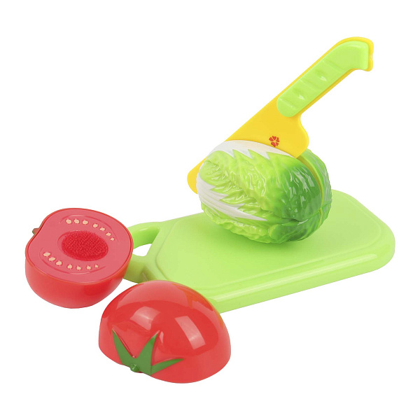 Игровой набор предназначен для увлекательных игр и обучения малышей. В комплект входят 8 разрезанных пластиковых овощей и фруктов, разделочная доска, нож и две тарелки. Овощи и фрукты соединяются липучками — их легко разрезать и склеить обратно. Фигурки изготовлены из пластика, безопасного для детей.